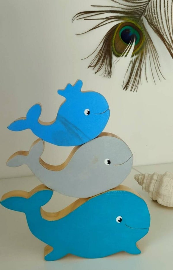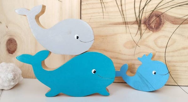 Décoration en pin pour chambre d'enfants avec cette jolie famille de 3 baleines pouvant également servir de jeu d'équilibre et de manipulation.