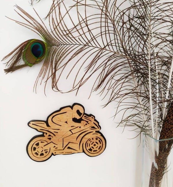 En contre plaqué, moto entièrement découpée à la scie à chantourner, poncée et vernis à la main et collée sur un fond noir.