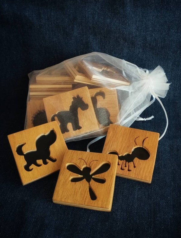 Original et entièrement fait main (découpe, peinture, vernis norme jouets), ce jeu de mémoire est fabriqué en contre plaqué. Il sera livré avec un pochon de rangement.